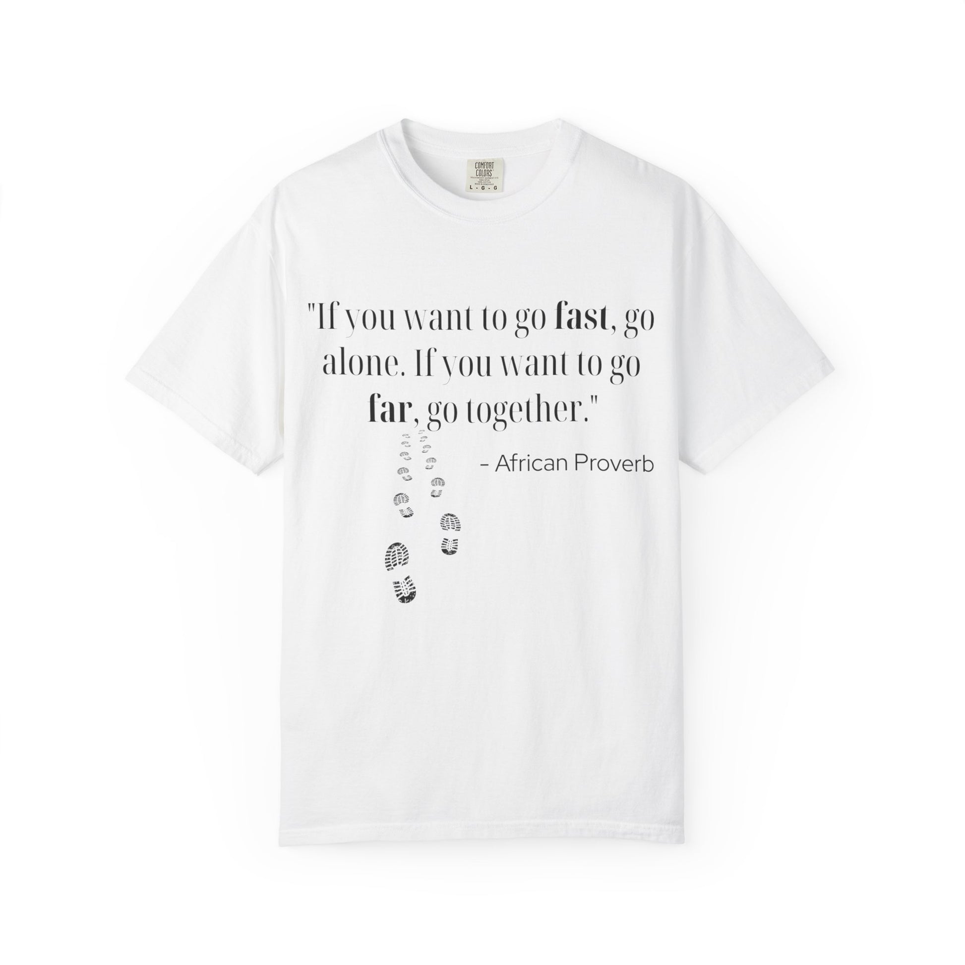 This Unisex Garment-Dyed T-shirt features a wise African Proverb 'If you want to go fast, go alone If you want to go far, go together'. It gives off a sense of wisdom and unity, making it perfect for those who value collaboration and teamwork. Ideal for adults, this tee is great for everyday wear and can be a thoughtful gift for friends, family, or coworkers. Perfect for occasions like team-building events or community gatherings.
