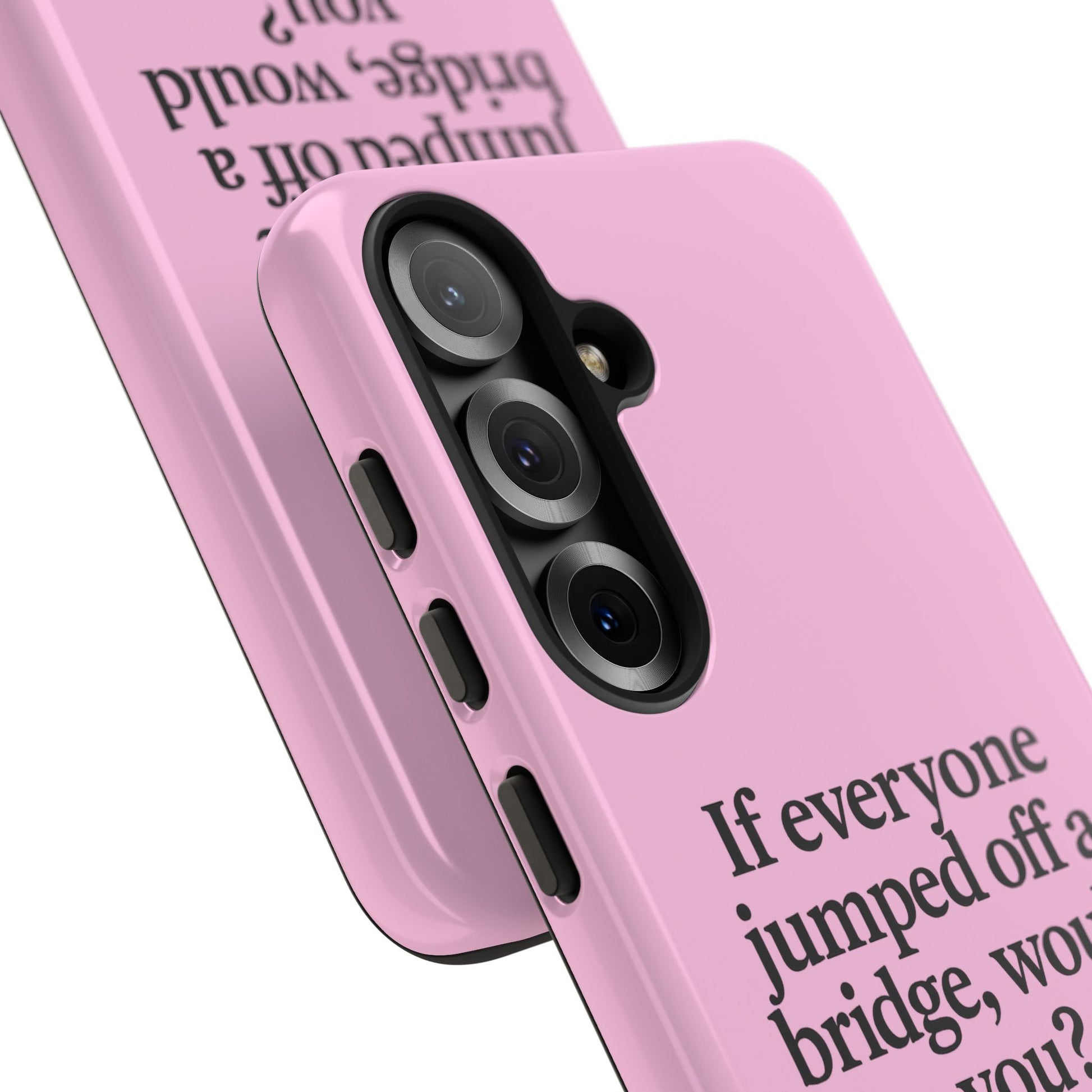 Protect your phone while carrying Mom's most extreme hypothetical response to peer pressure. This cleverly designed case features the ultimate escalation: "If everyone jumped off a bridge, would you?" — My Mom / Every Mom Everywhere.
