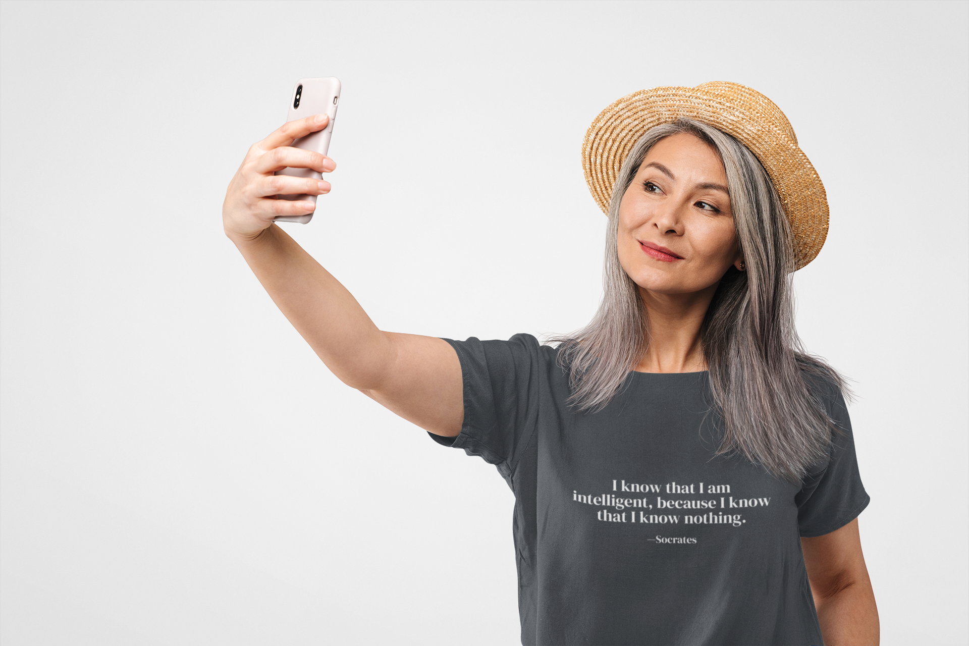 Wear the ultimate intellectual paradox from the father of Western philosophy. This brilliantly designed t-shirt features Socrates' famous declaration of learned ignorance: "I know that I am intelligent, because I know that I know nothing" — the perfect expression of philosophical sophistication that recognizes true wisdom begins with acknowledging the limits of our knowledge.